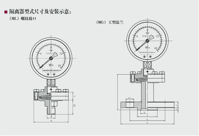 隔膜式壓力表由于采用間接測量結構,適用于測量粘度大、易結晶、強腐蝕、溫度較高的液體、氣體或顆粒狀流動固體的壓力。隔離膜片有多種材料以適應各種不同腐蝕性介質。